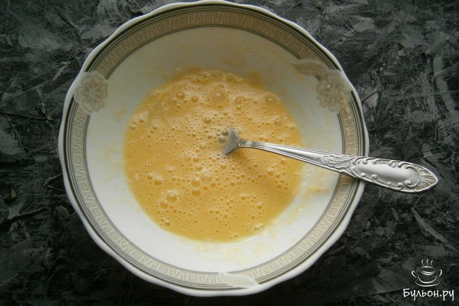 1. Предварительно нужно приготовить яичные блинчики. Для этого, разбить в миску два яйца, добавить чуть соли.