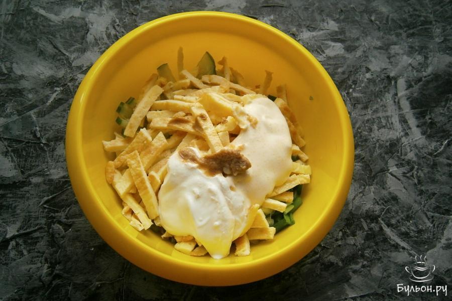 9. Салат посолить, добавить по 2 ложки сметаны и майонеза, а также, обычную готовую горчицу. Влить капельку лимонного сока.