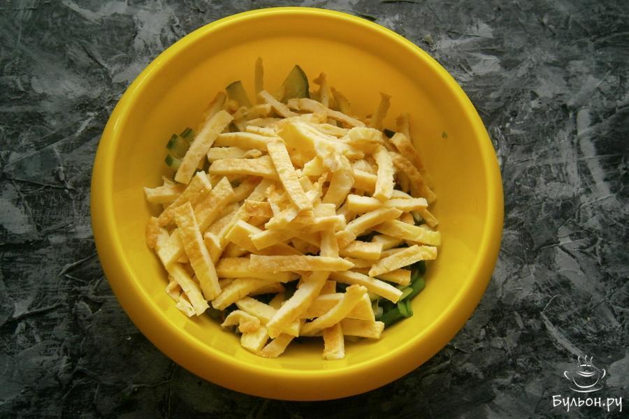 6. Куриное филе, предварительно отваренное и остуженное, порезать длинными кусочками или разобрать на волокна.
