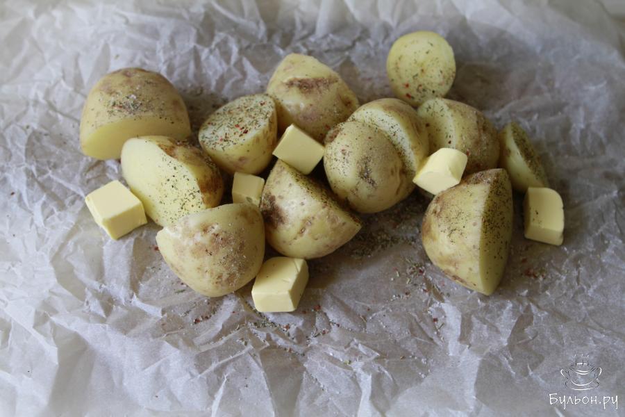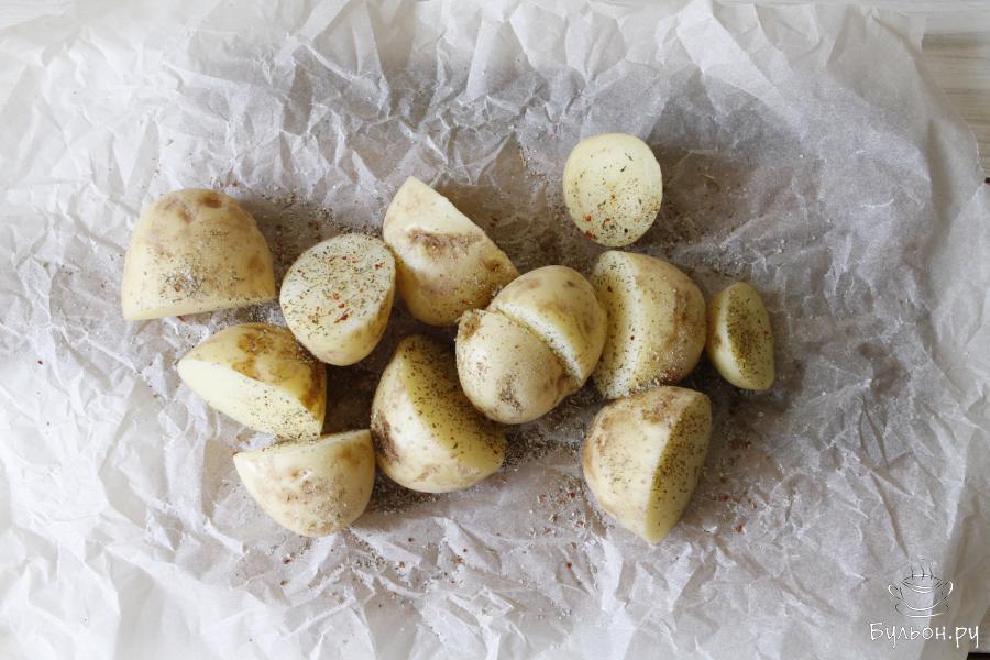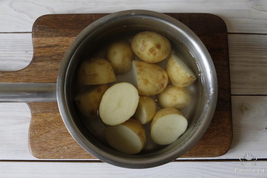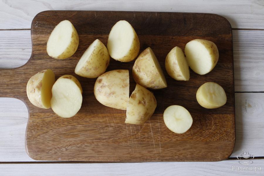 1. Подготовить клубни картофеля. Так как картофель молодой, то можно его не чистить. Необходимо его просто хорошо промыть и разрезать пополам.