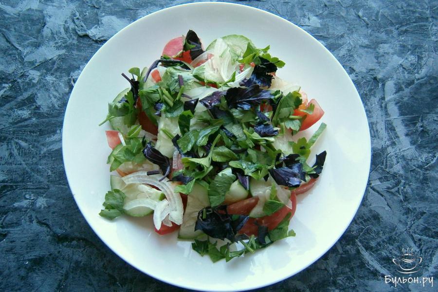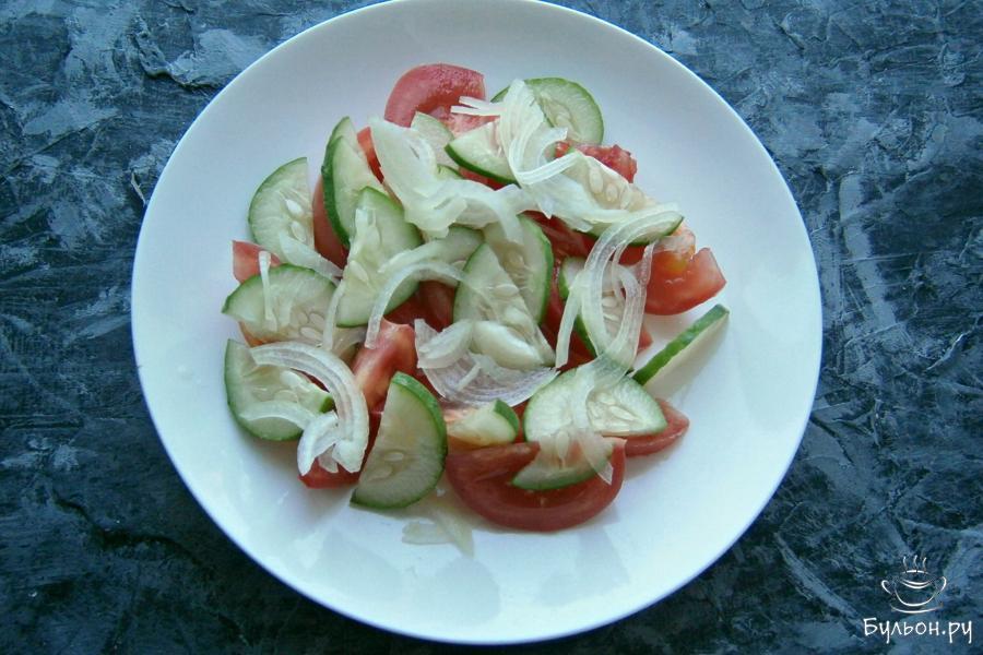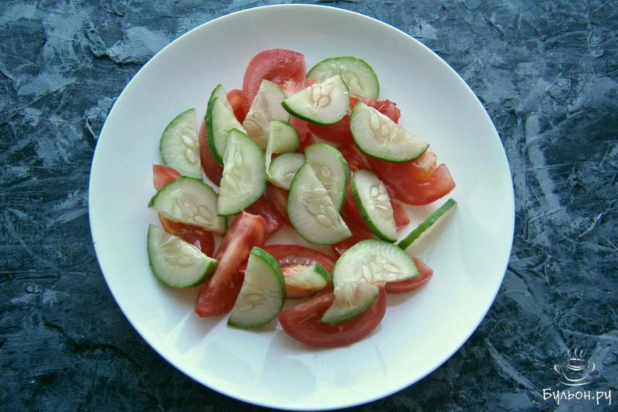 1. На плоскую тарелку порезать спелые, но тугие помидоры дольками, добавить порезанный тонкими полукружками свежий огурец.