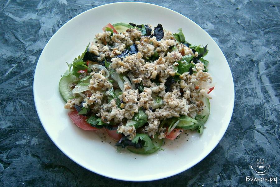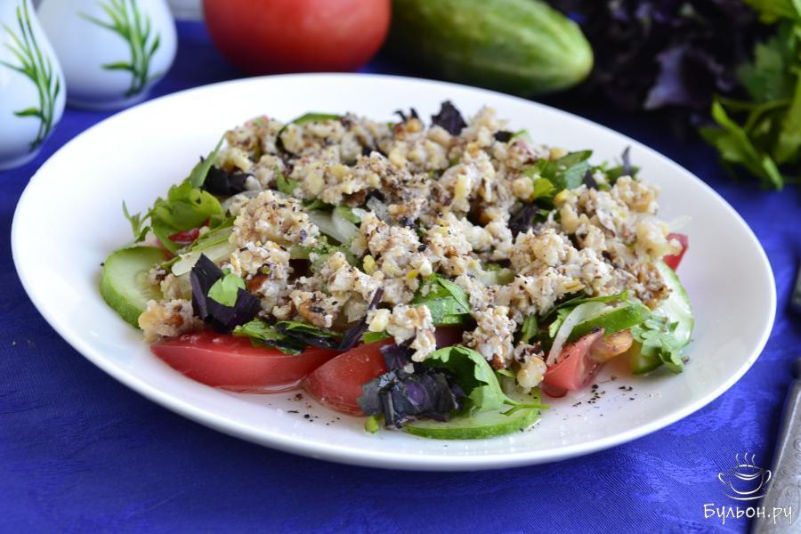 Грузинские блюда отличаются от других блюд пряным, острым вкусом, в них всегда много зелени. Предлагаю вам попробовать вкуснейший грузинский салат, который готовится с грецкими орехами. Салатик имеет яркий и интересный вкус, он достаточно острый, легкий, но в тоже время и сытный. Салат получается не только вкусным, но и полезным, к тому же, готовится он просто, практически за считанные минуты. Этот салат отлично подойдет, как дополнение, к жареному на сковороде или мангале мясу или рыбе. По-желанию, вместо сухого молотого перца чили можете использовать свежий.