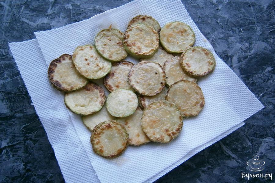 3. Обжарить кабачки на достаточном количестве растительного масла с обеих сторон, затем, выложить на бумажное полотенце.