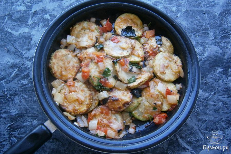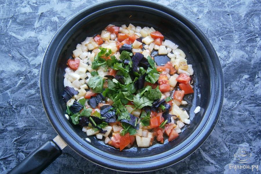 7. Обжарить все вместе еще 2-3 минуты, далее, добавить порезанную не слишком мелко зелень базилика и петрушки.