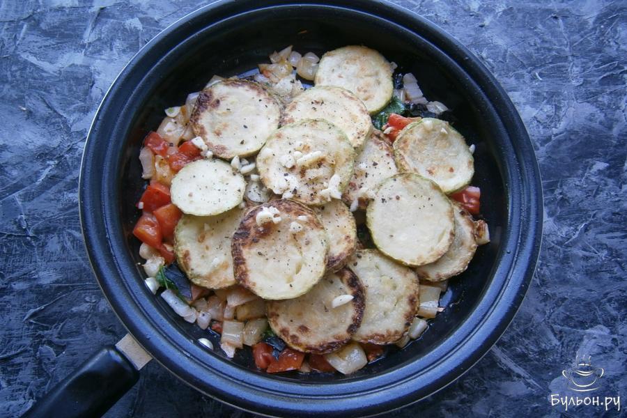 8. Все перемешать, добавить подготовленные жареные кабачки, поперчить, сюда же - измельченный чеснок, блюдо посолить.
