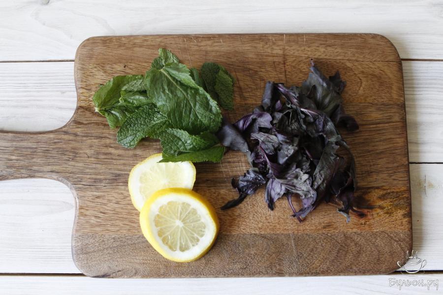 2. Листочки базилика мяты освободить от веточек. Промыть хорошо под проточной водой. Нарезать пару долек лимона.