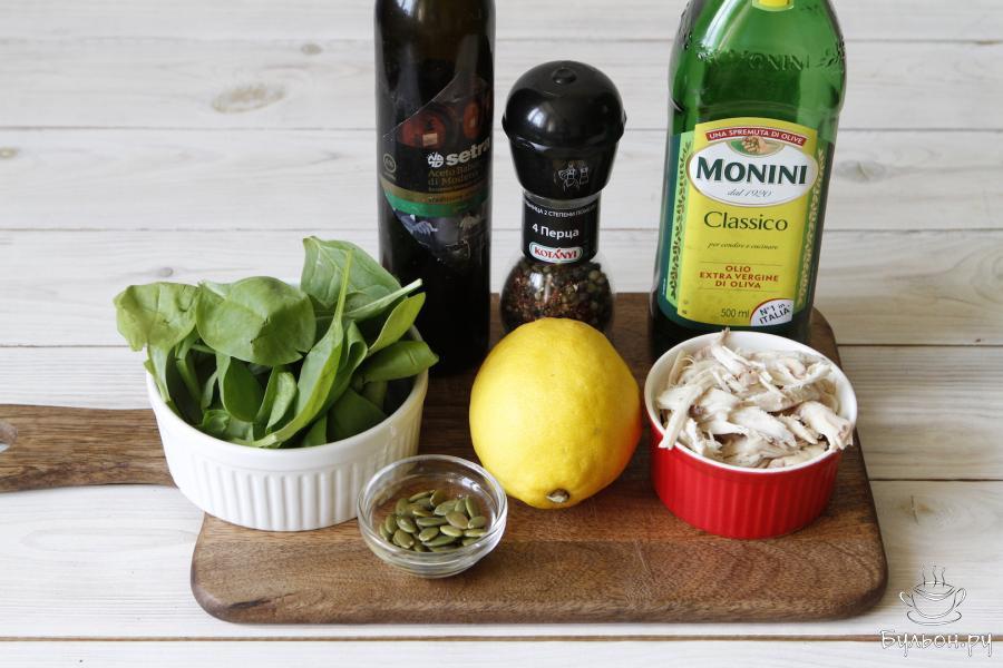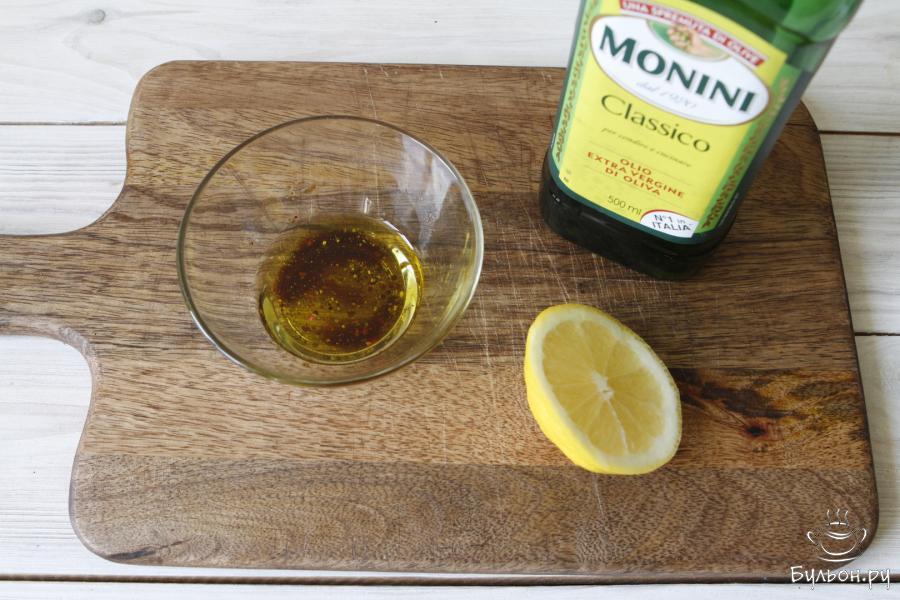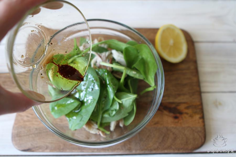 4. Для заправки приготовить оливковое масло, сок лимона и бальзамический уксус. Черный молотый перец добавить по вкусу. Соединить все ингредиенты в пиале и размешать.