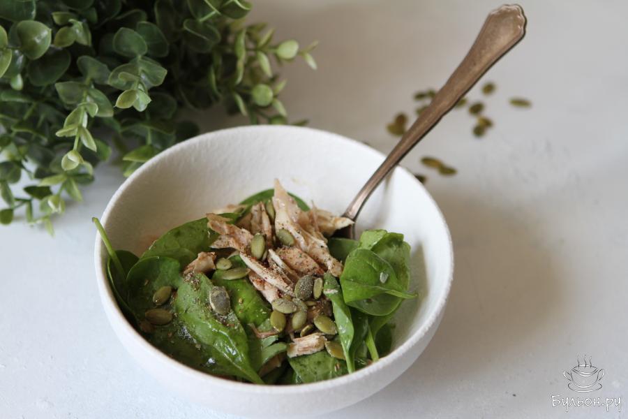 Летом чаще всего мы выбираем блюда, которые сочетают в себе пользу и легкость. Салат из свежего шпината с курицей как раз относится к таким блюдам. Его можно приготовить и на обед, и на ужин. Мясо курицы, филе грудки или бедра, можно отварить заранее, и тогда салат готовится очень быстро. В качестве заправки можно отдать предпочтение классической - из оливкового масла с бальзамическим соусом.