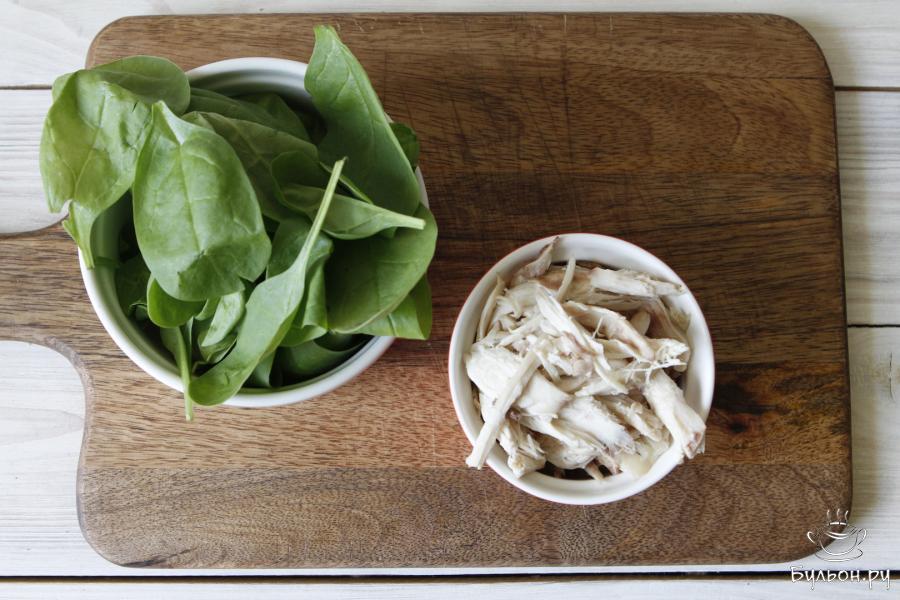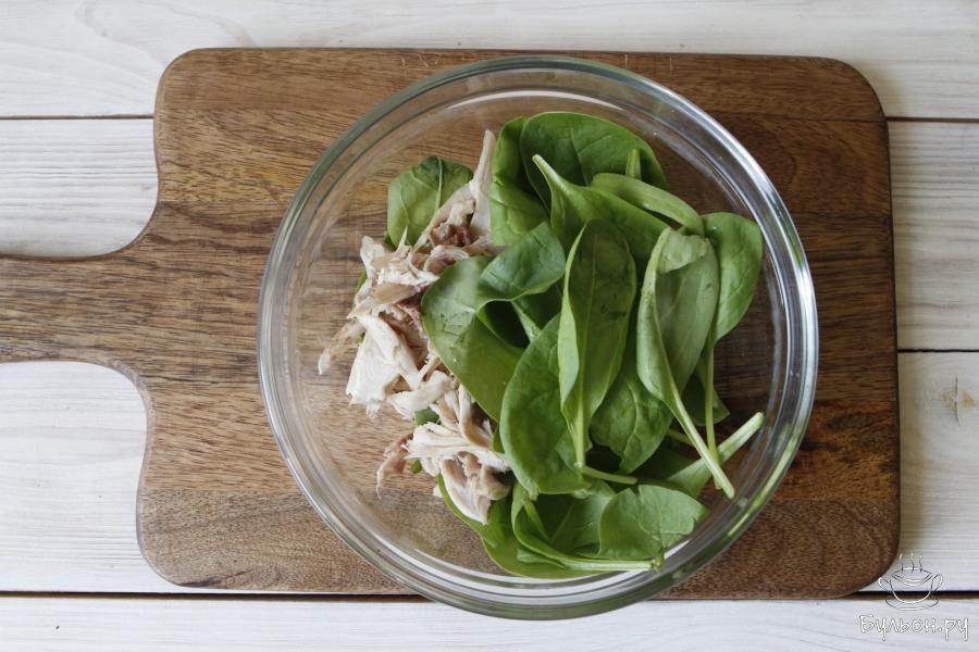 2. Филе куриное я отваривала заранее. Филе отварить, остудить и разделать. Листья свежего шпината промыть и обсушить.
