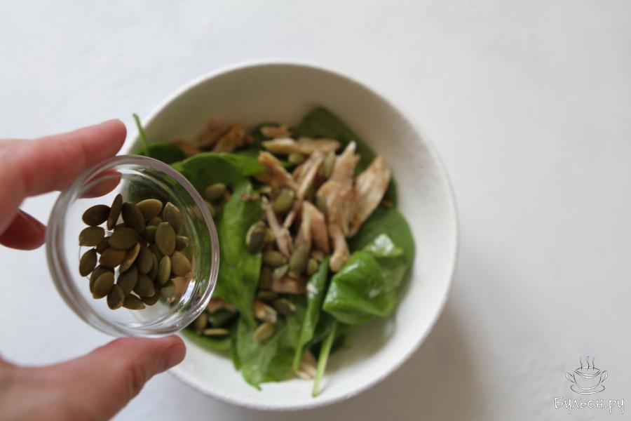 6. Перед подачей салата присыпать его семечками тыквы, которые предварительно необходимо подсушить на сковороде или в духовке. Салат готов к подаче. Приятного Вам аппетита.