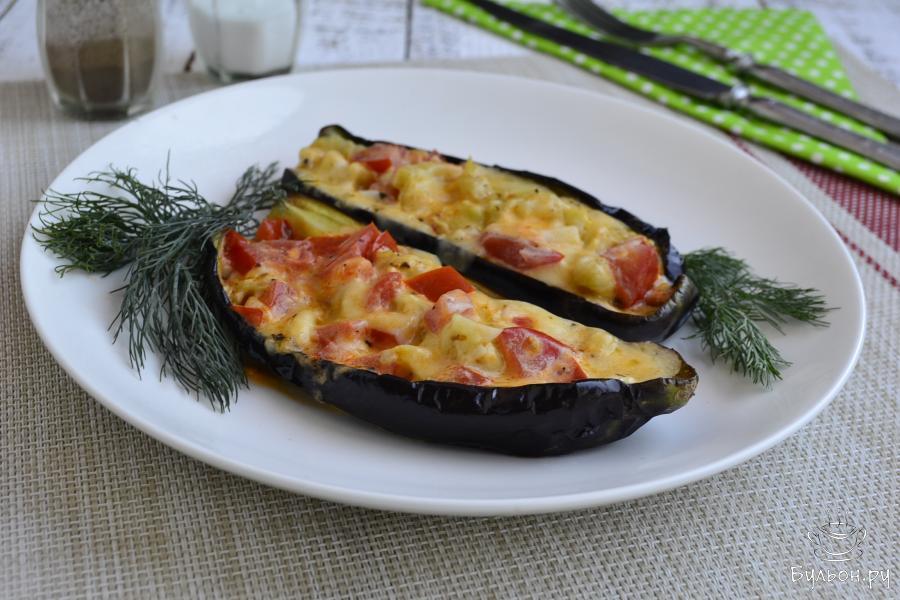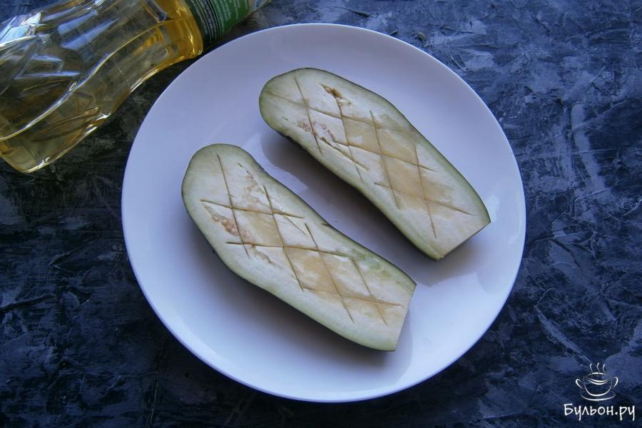 1. Баклажан помыть, обрезать хвостик, разрезать его вдоль на две части. На мякоти сделать крестообразные надрезы и полить сверху растительным маслом так, чтобы оно попало и в разрезы.