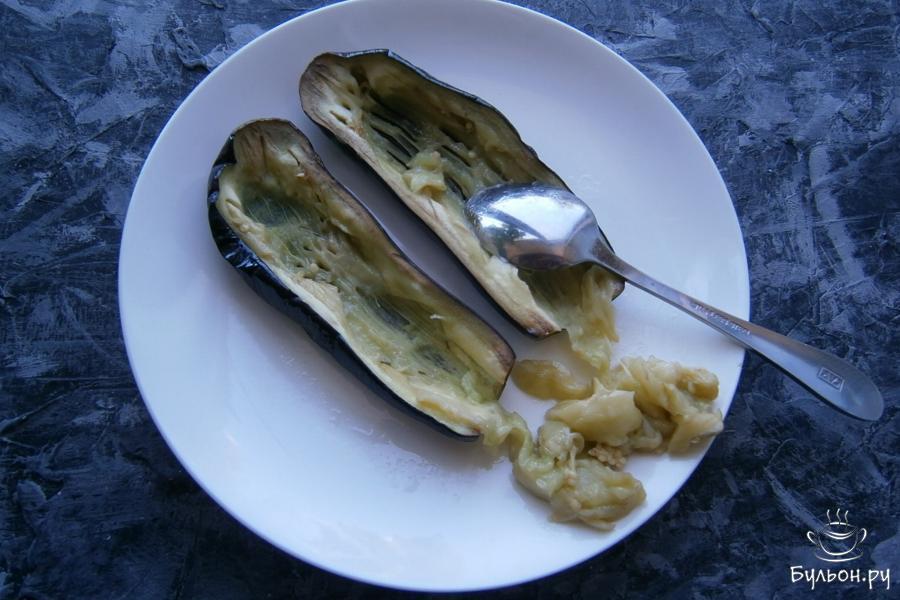 2. Отправить баклажаны, срезом вверх, в микроволновку. Готовить ровно 3 минуты с мощностью печи 750 Ватт. Ложечкой, аккуратно, вынуть из баклажанов мякоть.