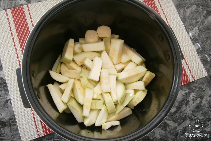 2. Крупно порезанные лук, морковку, болгарский перец добавить к кабачкам вместе с измельченным чесноком.