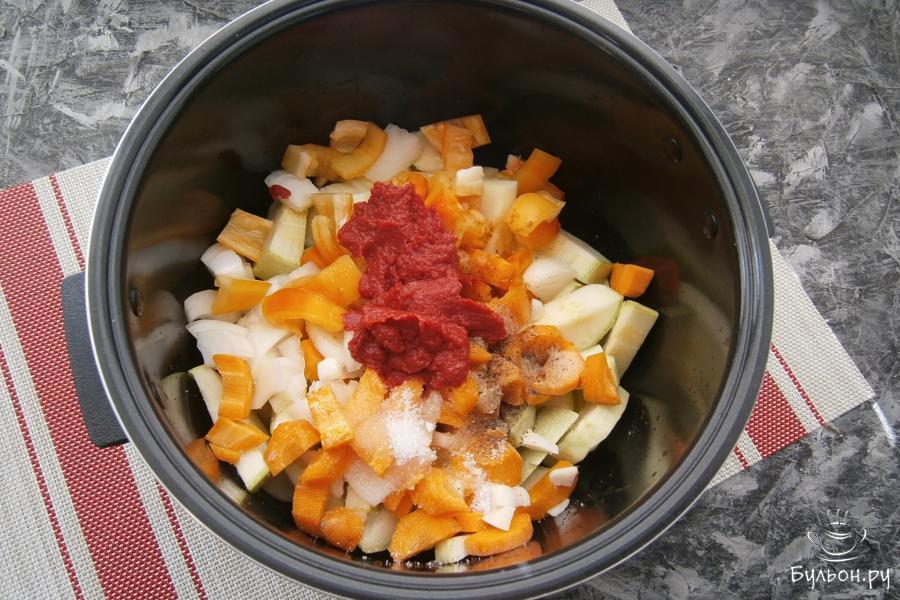 3. Добавить качественную томатную пасту. Влить воду и любое рафинированное растительное масло, всыпать сахар, перец - молотый черный и соль.
