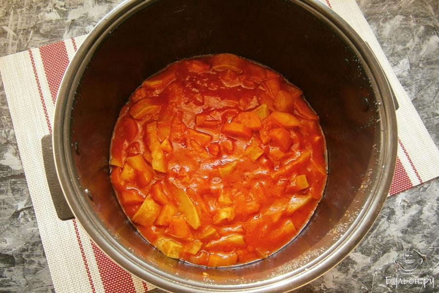 4. Также, всыпать молотый перец чили (по-вкусу), все перемешать. Готовить овощи на режиме "Тушение" 40 мин. Затем, выставить режим "Выпечка" на 10 мин.