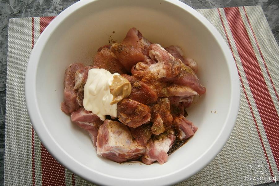 3. Сложить мясо в миску, добавить немного соли, влить соевый соус, посыпать хорошей приправой для мяса.