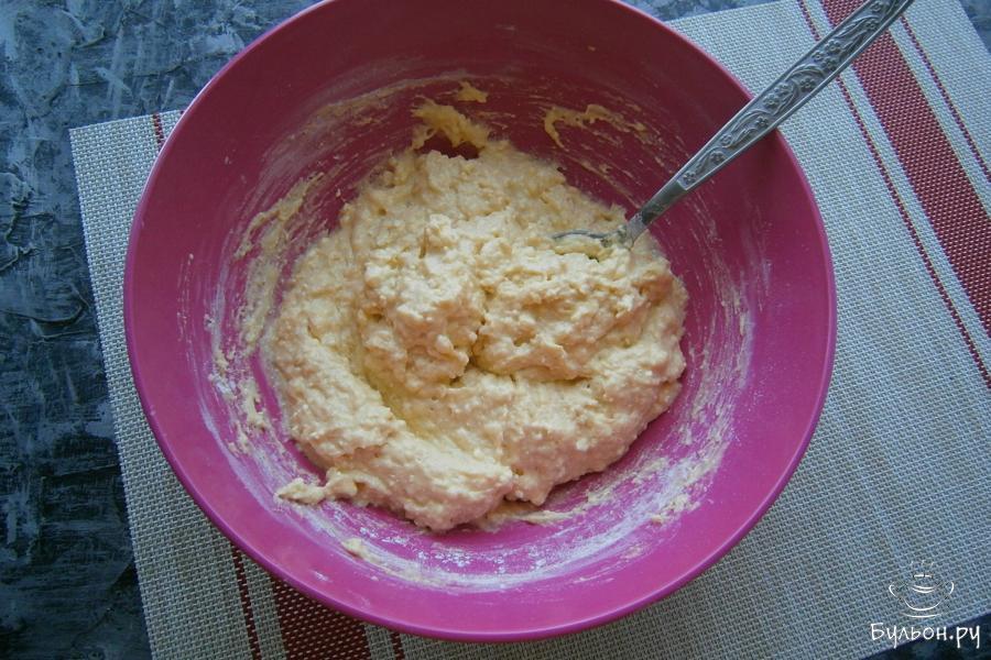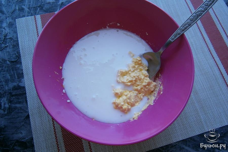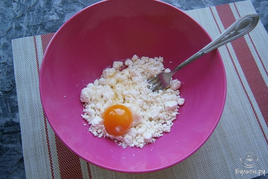 1. В мягкий базарный творог добавить одно среднее яйцо и щепотку мелкой соли. Тщательно растереть все вилкой.
