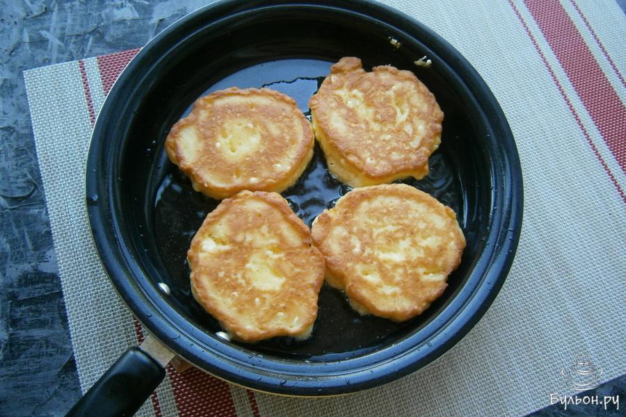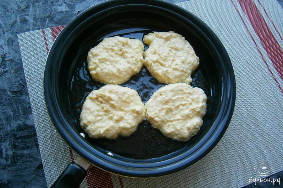 7. Ложкой выкладывать подготовленное тесто на горячую, с маслом сковороду в виде оладий. Жарятся оладьи достаточно быстро, на среднем огне.