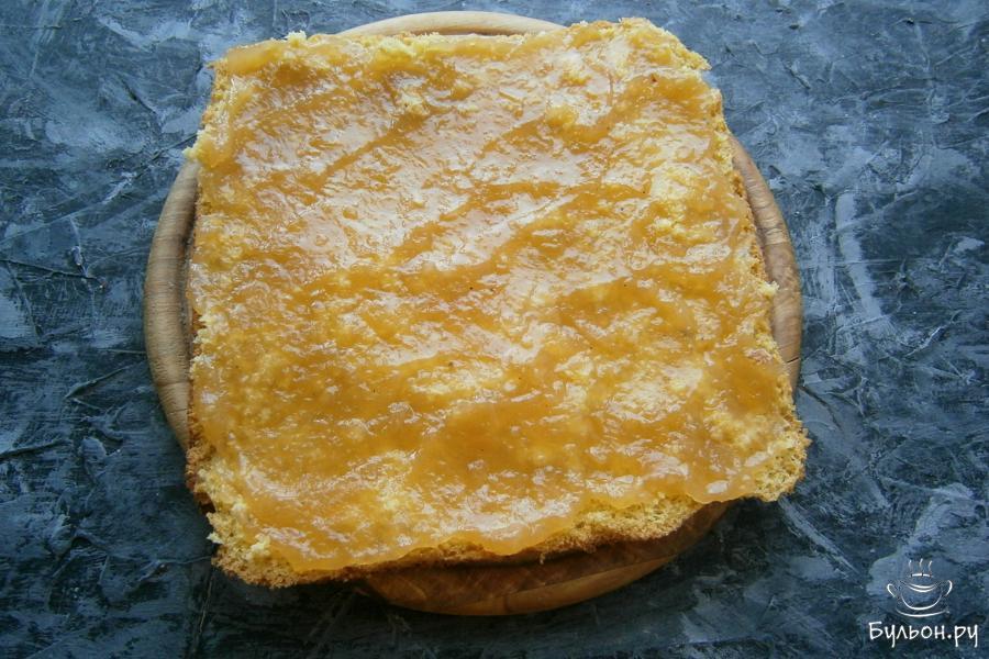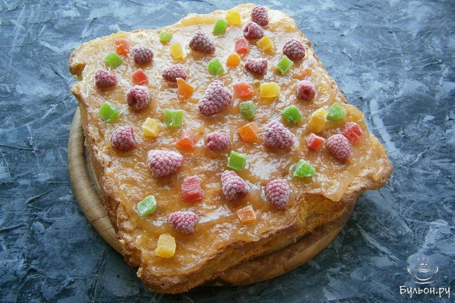 7. Накрыть второй частью, также, сверху смазать вареньем и украсить цукатами и малиной или другими ягодами.
