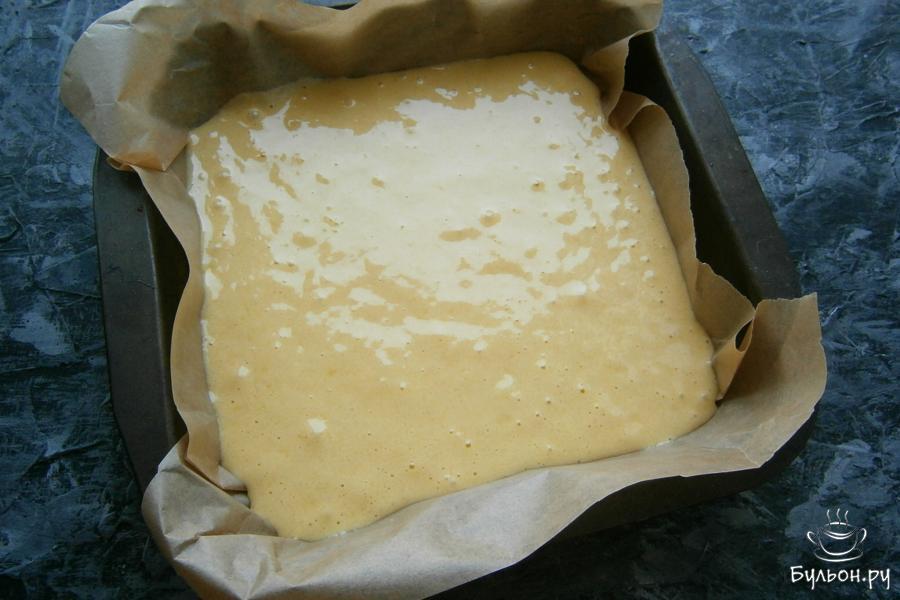 3. Тесто получится похожим на хороший крем или сметану. Его нужно переложить в любую форму, застеленную пергаментом. У меня форма квадратная - 23 х 23 см.
