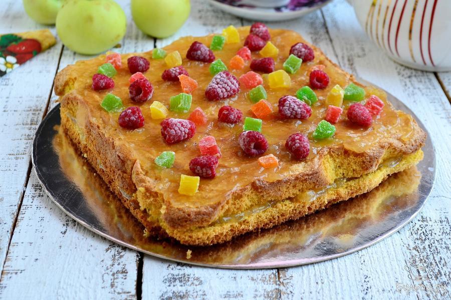 Если вам нужно что-то быстро испечь к вечернему чаю для своих близких или вдруг, позвонили гости, что нагрянут в ближайшие часы, предлагаю простой рецепт бисквитного пирога. Готовится он из самых простых продуктов, которые практически всегда есть в наличии. Для пирога я использовала густое яблочное варенье, для украшения взяла цукаты и свежемороженную малину. Вы можете смазать пирог любым вареньем, джемом или повидлом, кремом и украсить его любыми ягодами, имеющимися на данный момент. Пирог очень вкусный, нежный, воздушный, сладкий, не требующий пропитки. Идеальная выпечка к чаю, попробуйте.
