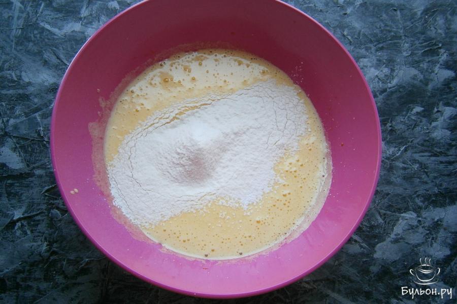 2. Миксером взбить яйца до пышной пены, постепенно всыпать сахар и добавить ванильный сахар, продолжая взбивать. Должна получиться светлая и пышная масса. Прямо в полученную массу просеять частями муку с разрыхлителем, замешивая тесто, каждый раз все полностью вмешивать.