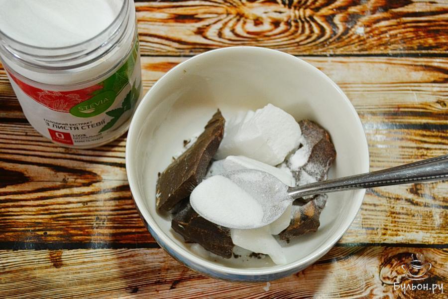 2. Для начала нам нужно растопить какао-продукты. Сразу же добавим и стевию. Растапливаем над паром.