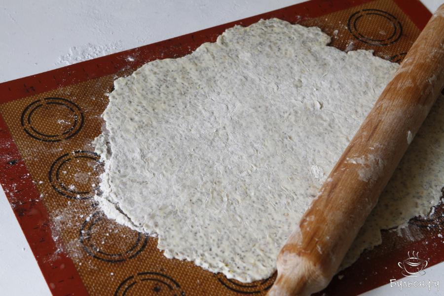 6. Тесто выложить на пергамент, а лучше на силиконовой коврик. Немного разровнять ложкой. Далее можно положить сверху лист пергамента (смазать его немного растительным маслом) и раскатать тесто. Я же присыпала его немного мукой и раскатала без пергамента.