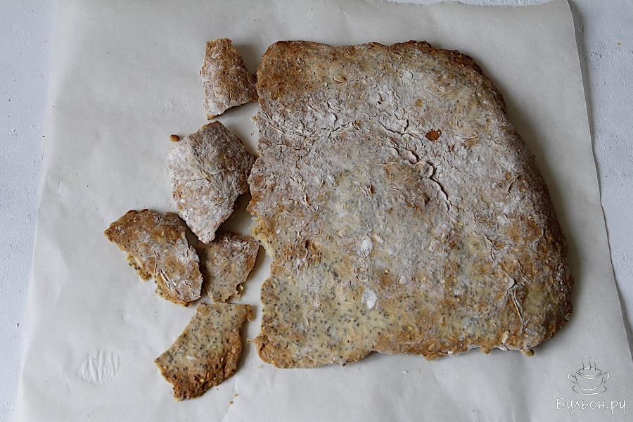 7. Отправить тесто в духовку и запекать примерно 25-30 минут при 185 градусах до румяной корочки. Далее стоит его немного охладить и поломать на кусочки.