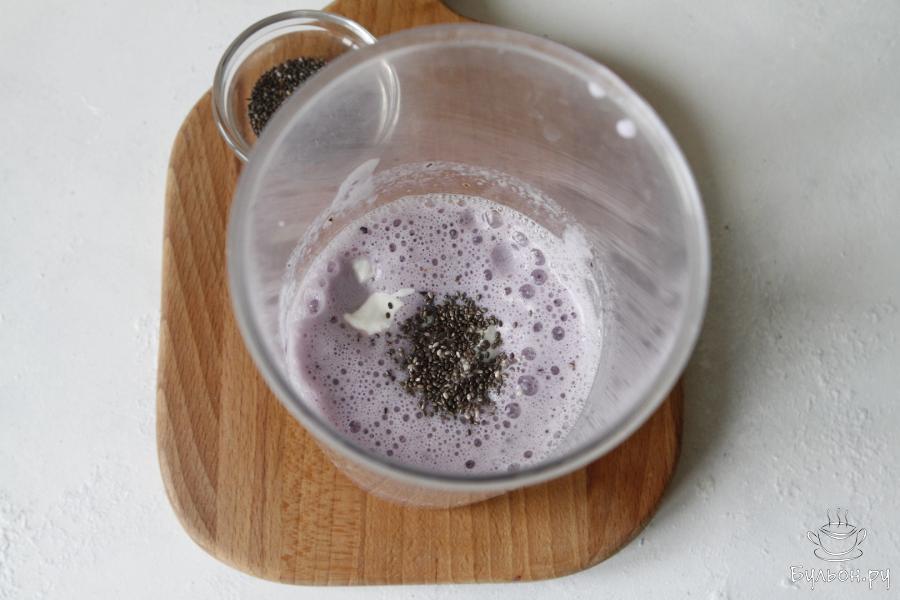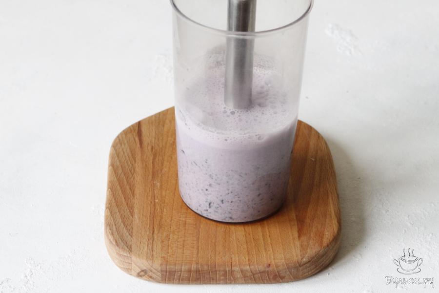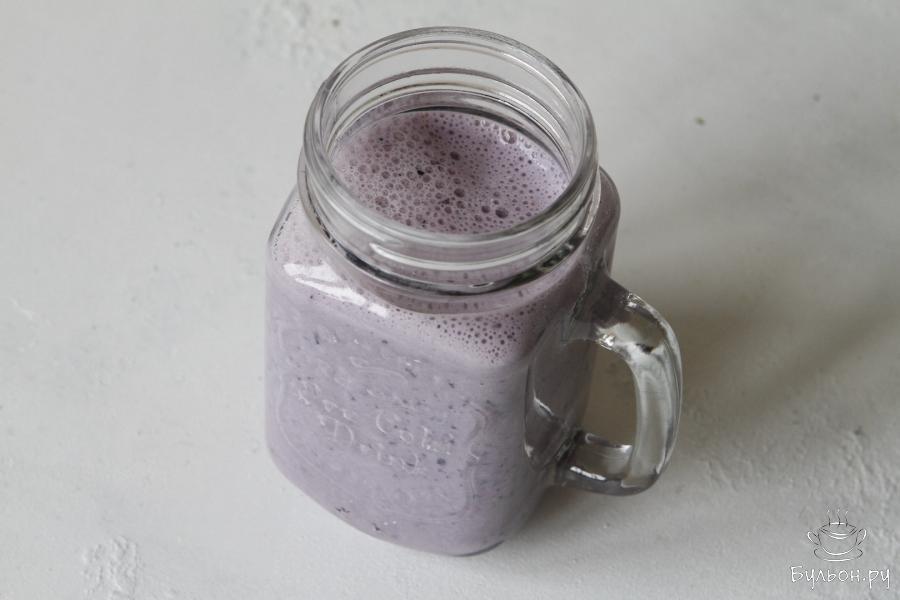7. Еще раз все ингредиенты хорошо пробиваем блендером. Коктейльную смесь разливаем по баночкам или стаканам и можно подавать к столу. Молочный коктейль с творогом и голубикой готов. Приятного Вам аппетита.