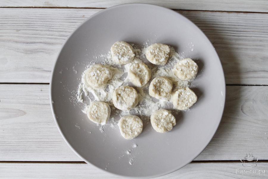 4. Рабочую поверхность присыпать мукой. Выложить из миски творожную смесь и замесить тесто. Оно не должно быть плотным, но будет немного прилипать к рукам. Не перекладывайте муки, иначе вареники получатся очень плотным, а они должны быть воздушными.