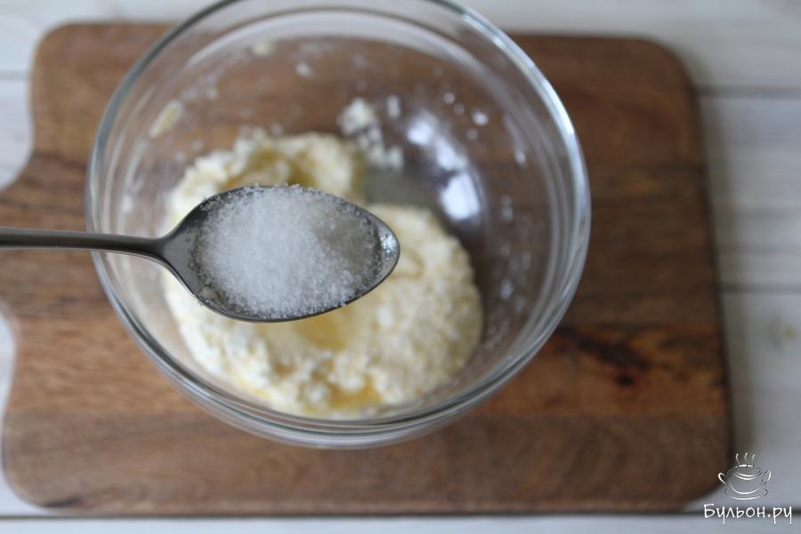 2. Хорошо растереть творог с яйцом. Добавить сахар ( количество можно увеличить или наоборот уменьшить, все зависит от ваших предпочтений).