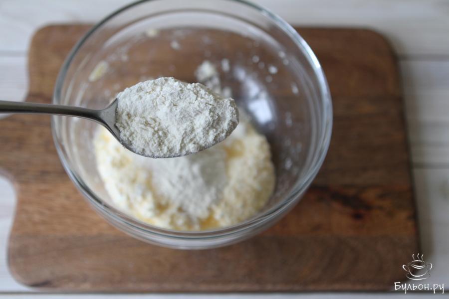 3. Просеять муку (100 гр) и добавить разрыхлитель. Муки в рецепте указано приблизительное количество, возможно вам потребуется чуть больше. 100 гр муки идет в тесто, остальное на распыление.
