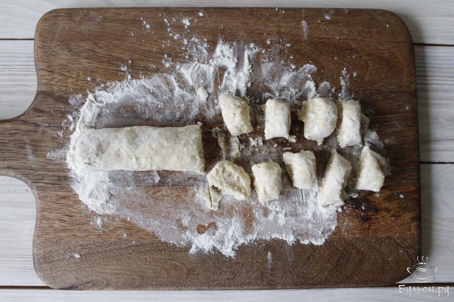5. Для удобства тесто разделить на несколько частей. Из каждой скатать колбаску. Порезать колбаску на небольшие кусочки.