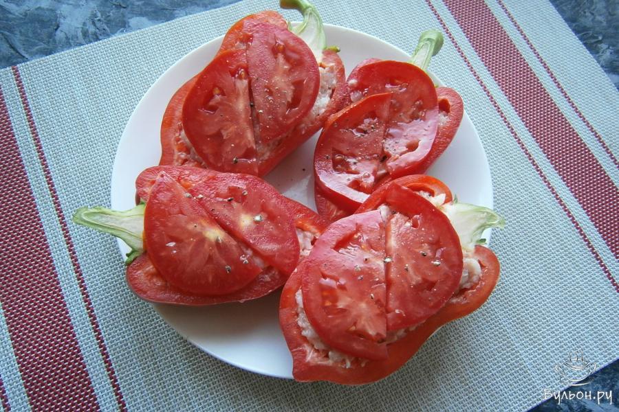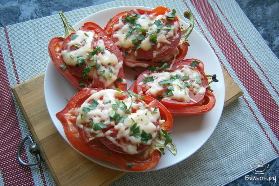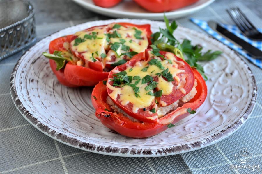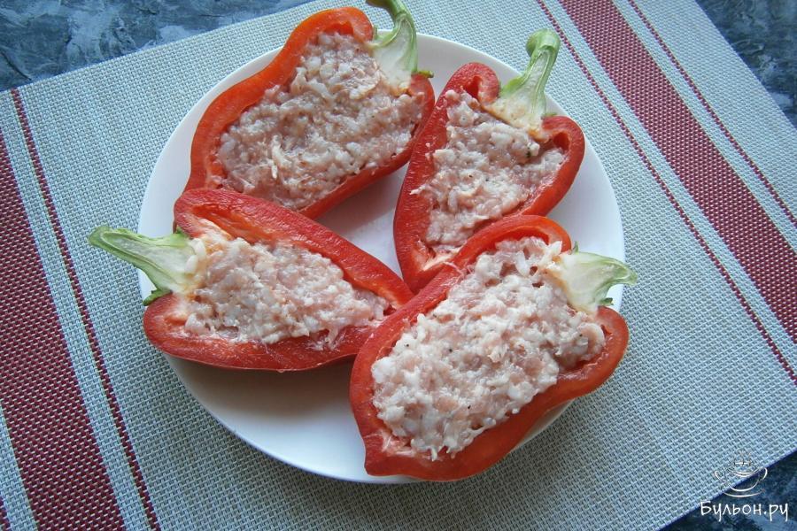 6. Заполнить фаршем подготовленные половинки перцев, разместить их на тарелке, предназначенной для готовки в СВЧ.
