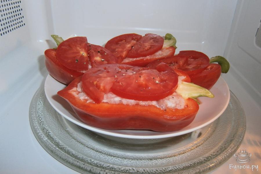 8. Отправить тарелку с фаршированными перцами в микроволновую печь на 8 мин., мощность выставить - 750 Вт.
