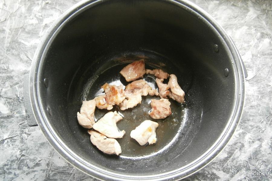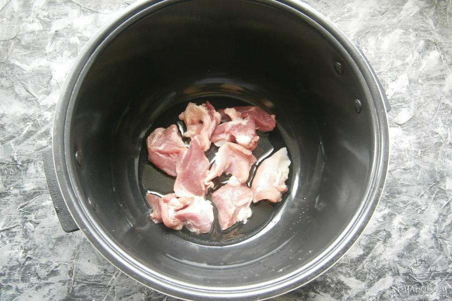 1. В чашу мультиварки влить любое растительное масло, выложить порезанную кусочками мякоть постной свинины.