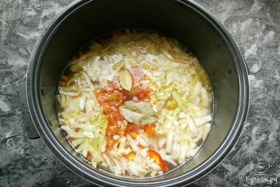 5. Капусту порезать соломкой, также порезать и болгарский перец, помидоры порезать кубиками. Добавить овощи в чашу мультиварки. Также, добавить лавровый лист, соль, приправу универсальную и немного черного перца.