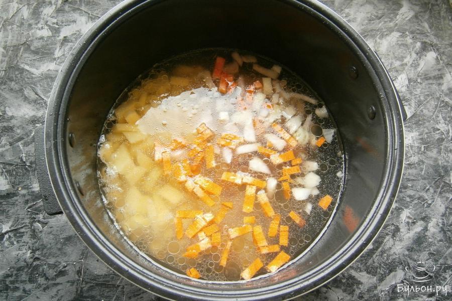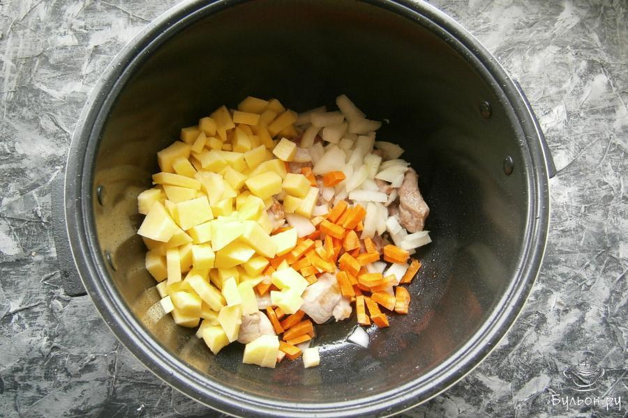 3. Далее, добавить порезанный кусочками лук, картофель, порезанный кубиками и морковь - небольшими кубиками.