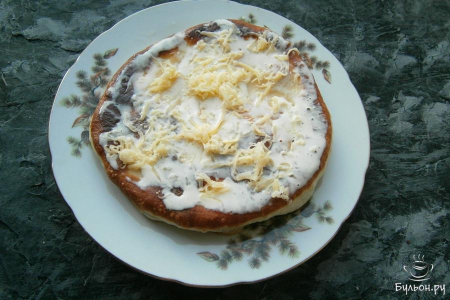 11. Горячий лангош обильно смазать подготовленной сметаной и посыпать хорошим, жирным тертым сыром. Также испечь и смазать все лепешки и сложить их одна на одну.