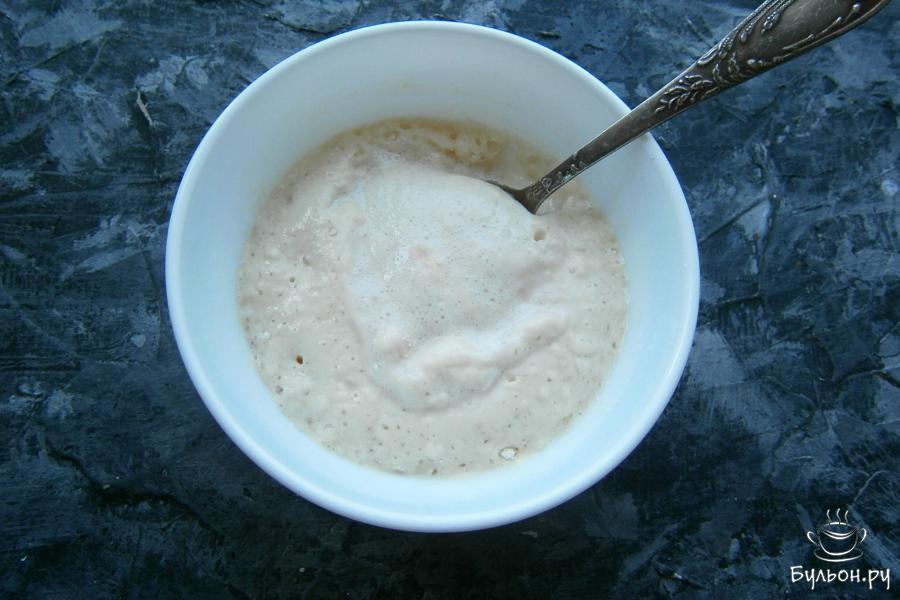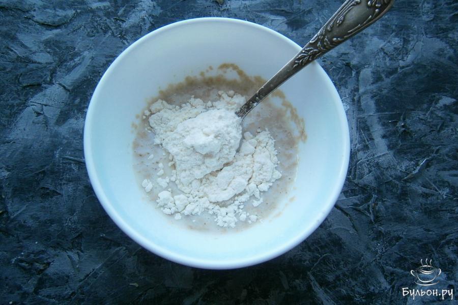 2. Добавить пару ложек муки, также, от общего количества, все перемешать, накрыть пленкой и оставить при комнатной температуре на 15 мин.