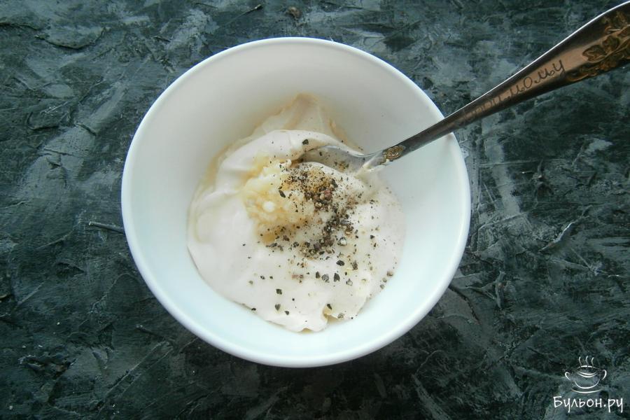 10. В густую, жирную сметану добавить перец, измельченный зубчик чеснока и четвертую часть чайной ложки соли, хорошо перемешать.