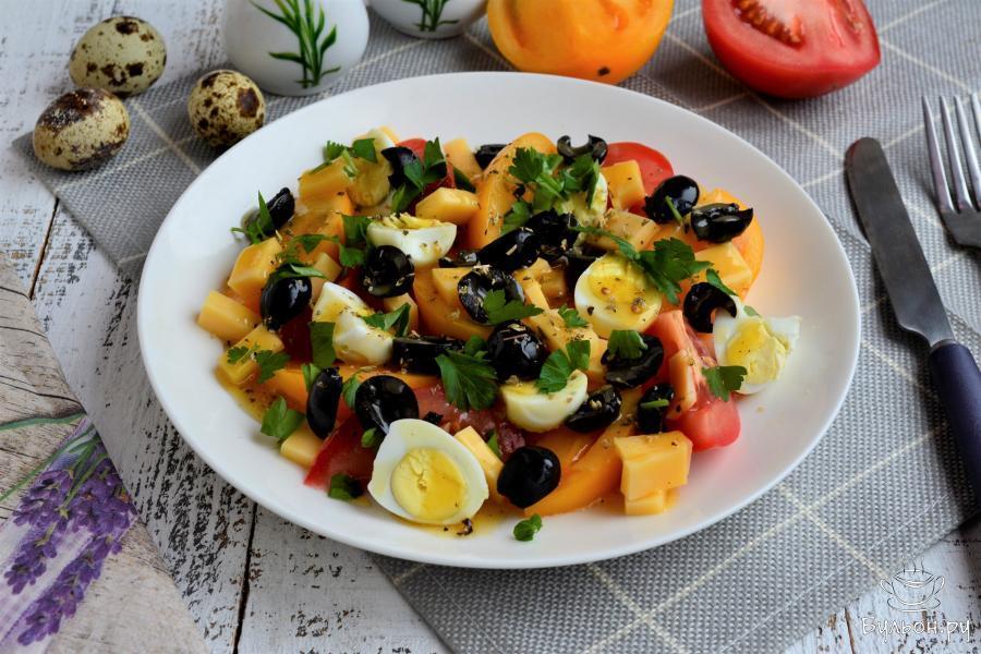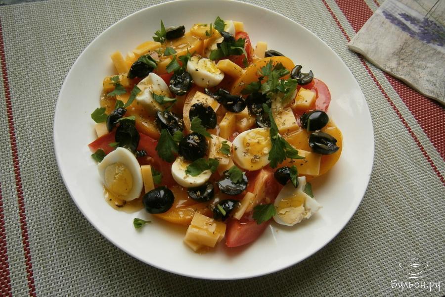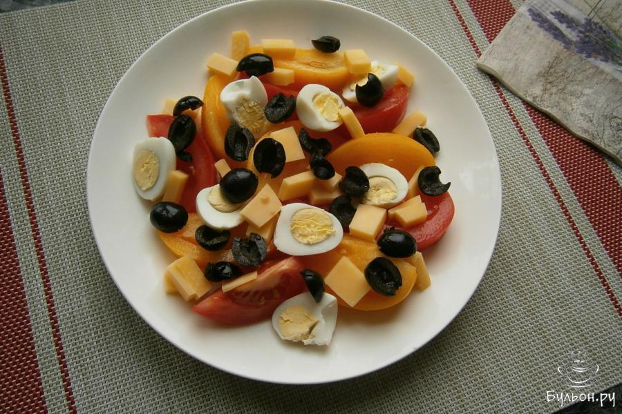 3. Оливки разрезать пополам, сыр твердый или полутвердый порезать небольшими кубиками. Сыр и оливки выложить поверх помидоров и яиц.