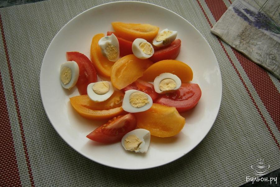 2. Помидоры порезать дольками и разложить их на плоской тарелке. Яйца очистить, разрезать на половинки и выложить между помидорами.