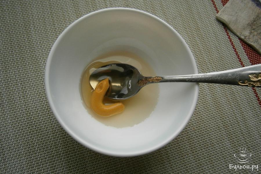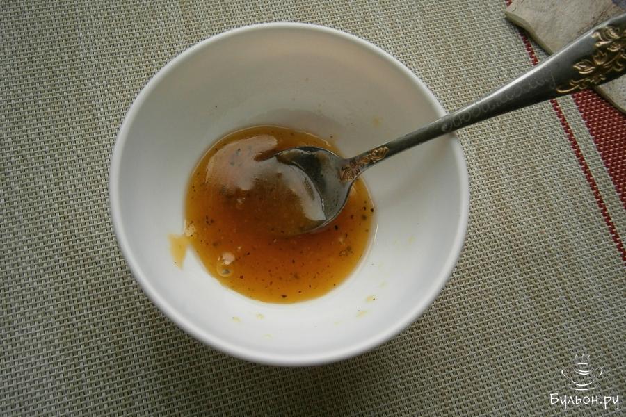 4. Для приготовления заправки: к растительному маслу добавить жидкий мед и готовую горчицу (можете выбирать острую или нежную - на ваш вкус).