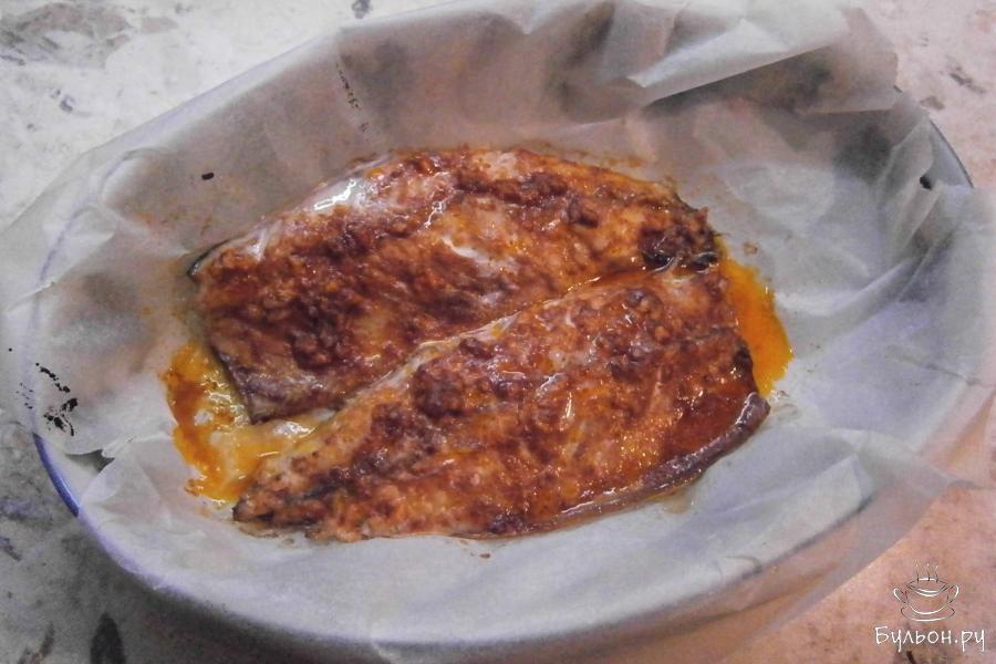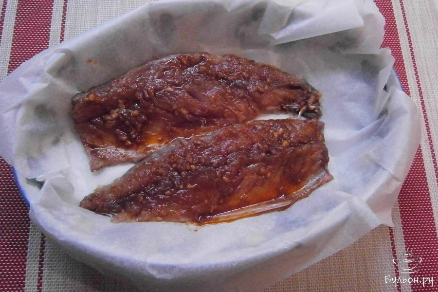 5. Разместить скумбрию, кожей вниз, в подходящей форме, застеленной пергаментом (это нужно для того, чтобы форма сильно не вымазывалась).