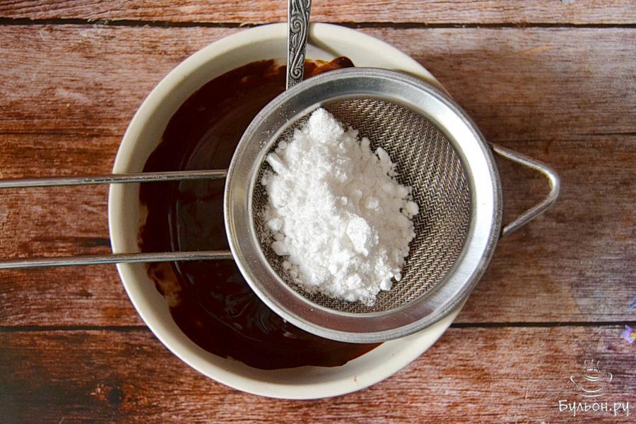 4. Когда примерно половина кусочков растопится, добавим пудру, просеяв ее через сито. Снова ставим массу над паром и продолжаем топить, постоянно помешивая. Температуру не поднимаем выше 45 градусов.