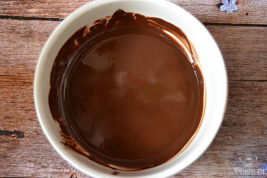 5. Растопленную массу протемперируем. Для этого, постоянно помешивая, дождемся, пока температура массы не опустится до 27 градусов. После этого снова нагреем массу на водяной бане до 32 градусов, помешивая.