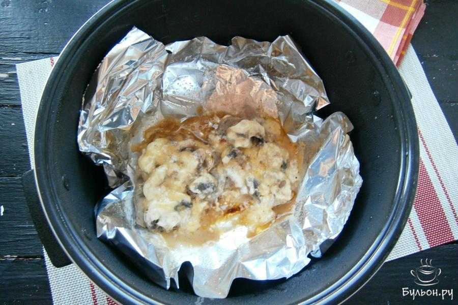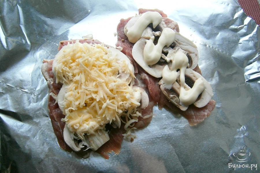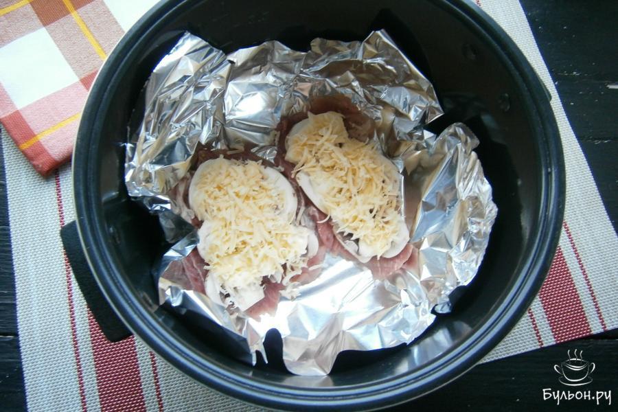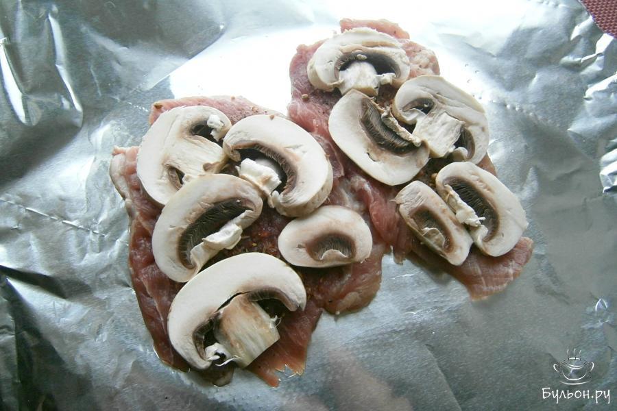 3. Поместить мясо на фольгу, сложенную вдвое. На мясо выложить порезанные пластинами свежие шампиньоны.