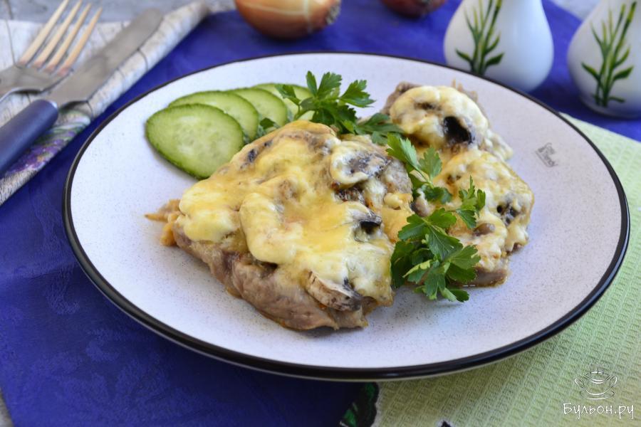 Наверное, многие знают такое блюдо, как мясо по-французски и очень любят его. Готовится блюдо обычно в духовке, а я предлагаю сделать это в мультиварке за 18 минут. Я использовала свинину, можете взять курицу, телятину, индюшатину и т. д. Мясо получается нежным и мягким, чуть поджаристым снизу, внутри сочная начинка из грибов, а сверху - расплавленный сыр. Это блюдо можно подать на ужин, а можно и на праздничный стол с любым, на ваше усмотрение, гарниром. Попробуйте, очень вкусное мясо и готовится просто и быстро.